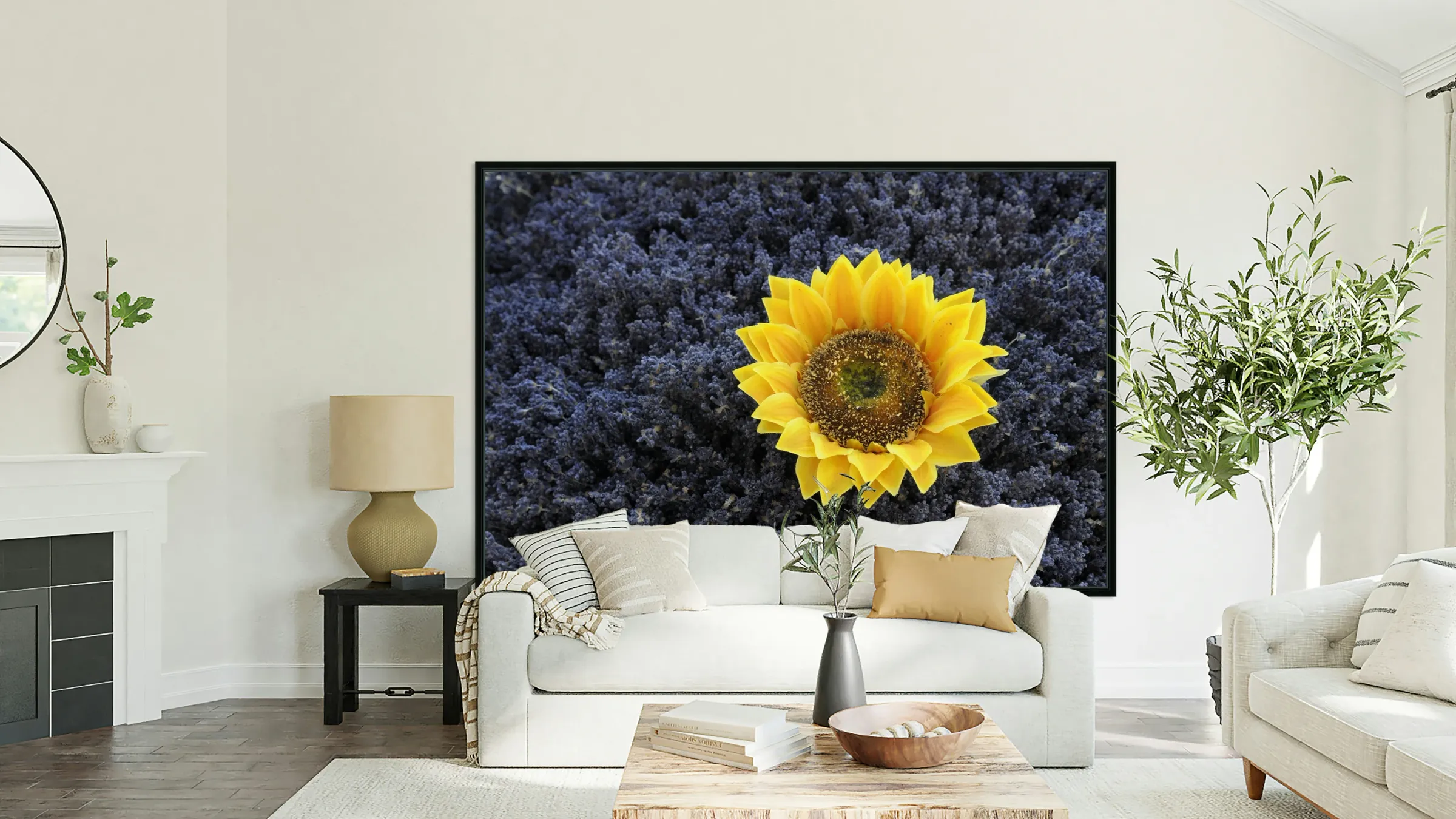 Dried sunflower in a bed of lavender flowers at Lourmarins street market Picture Frame Printing