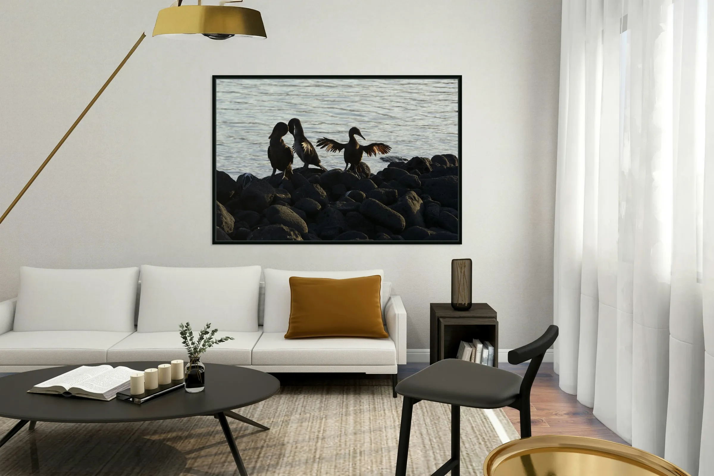 Flightless Cormorants Phalacrocorax harrisi stretching their wings Punta Espinosa Fernandina Island Galapagos Islands Ecuador Picture Frame Printing