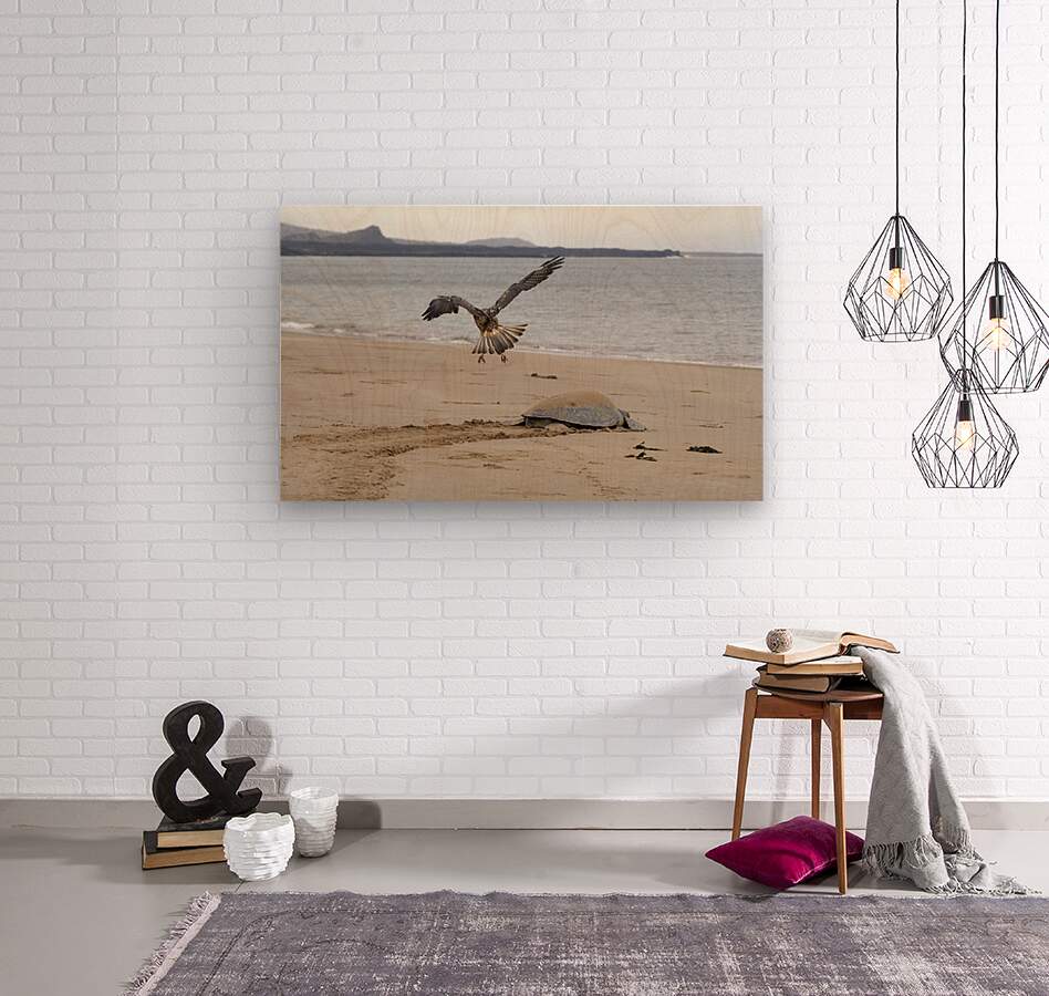 ABOUT THIS ARTWORK: GALAPAGOS HAWK BUTEO GALAPAGOENSIS FLYING ABOVE A GALAPAGOS GREEN TURTLE PLAYA ESPUMILLA SANTIAGO ISLAND GALAPAGOS ISLANDS ECUADOR