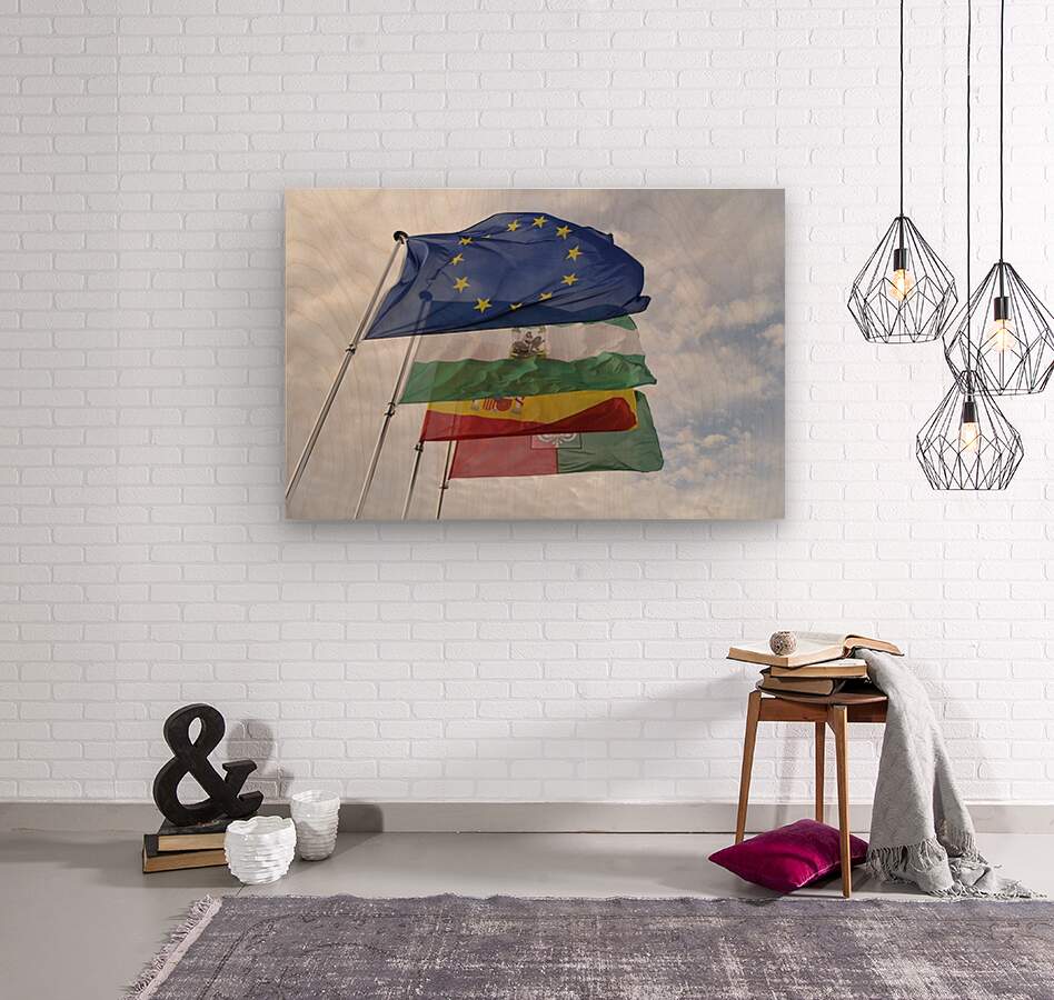 ABOUT THIS ARTWORK: FLAGS ON THE VELA TOWER THE ALHAMBRA GRANADA ANDALUSIA SPAIN