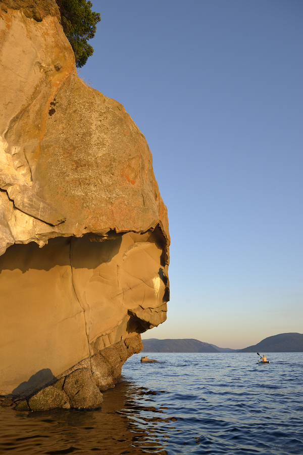 Sea kayaking under the sculpted sandstone cliffs at sunset Tent Island Gulf Islands British Columbia Canada
