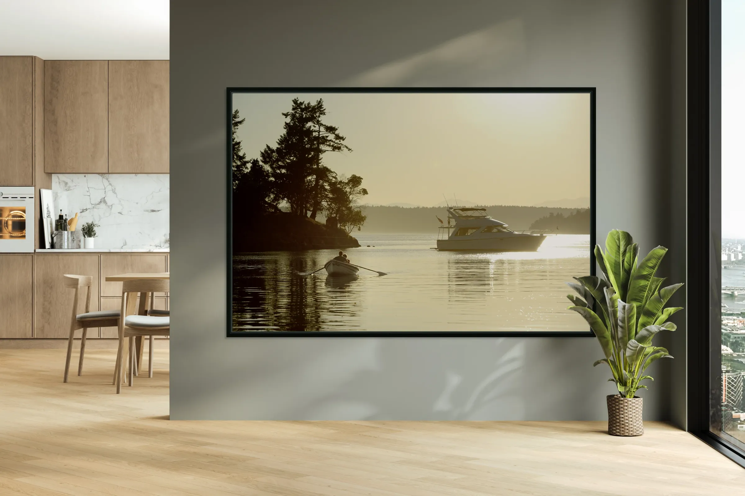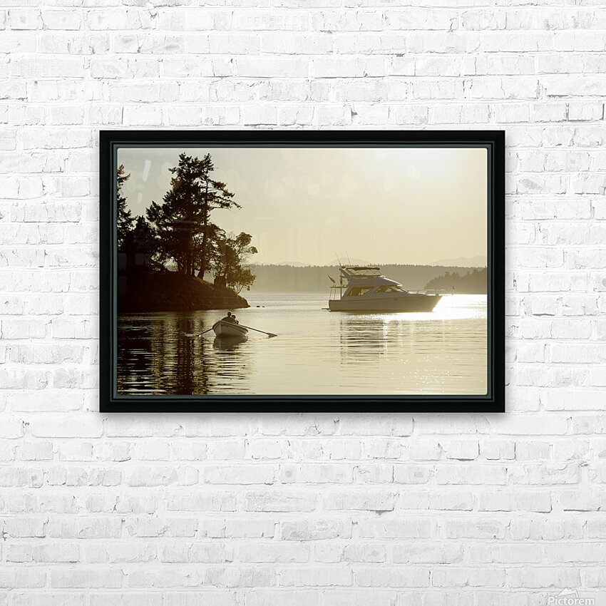 Couple in a dinghy rowing in front of a pleasure motorboat Picture Frame Printing