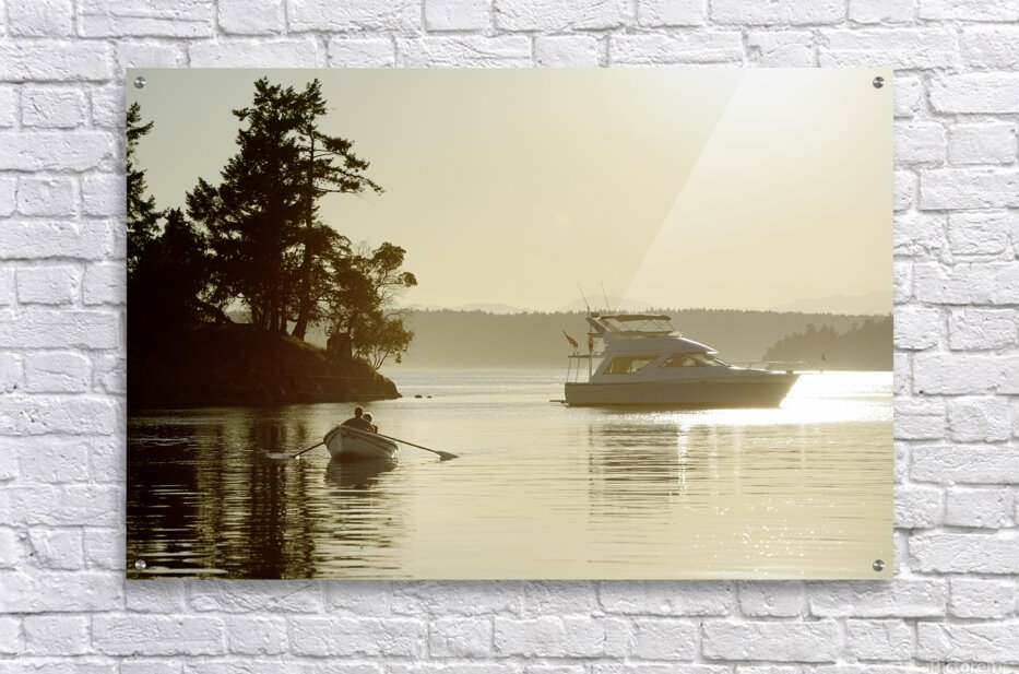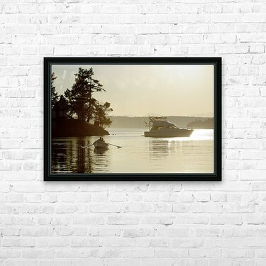 Get this artwork "Couple in a dinghy rowing in front of a pleasure motorboat" in a framed print.