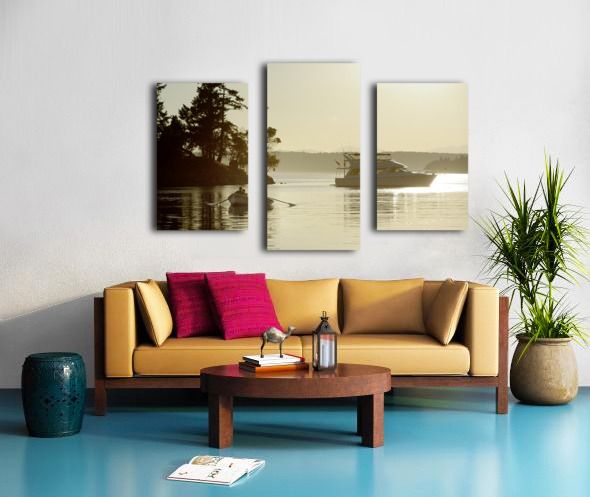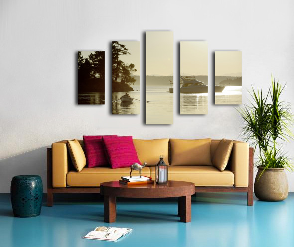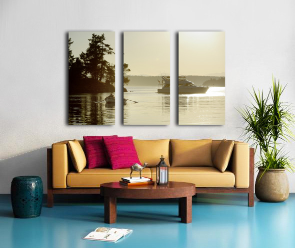 Couple in a dinghy rowing in front of a pleasure motorboat Canvas print