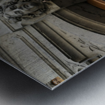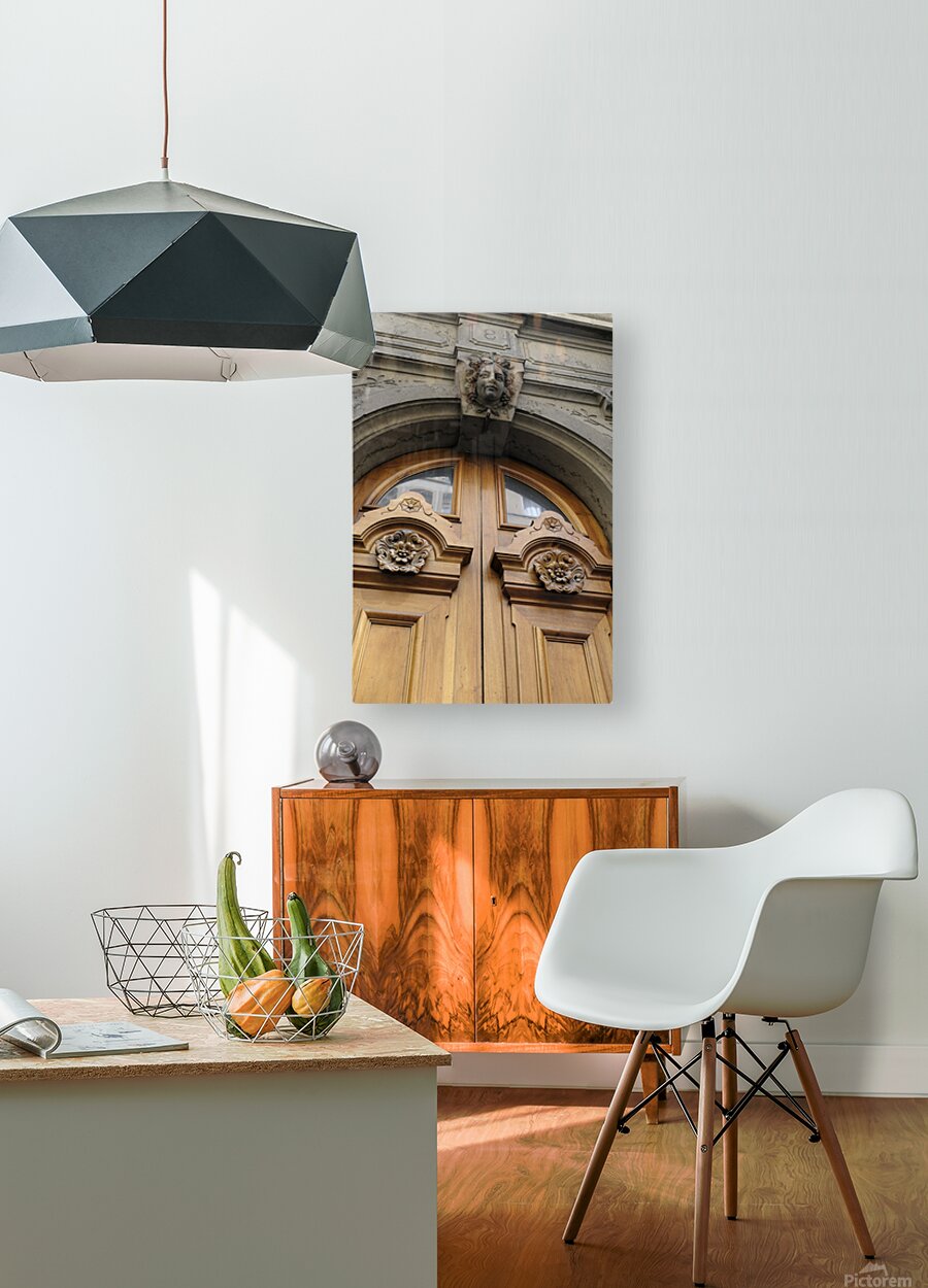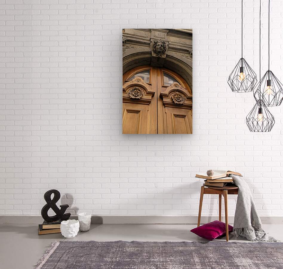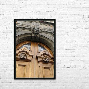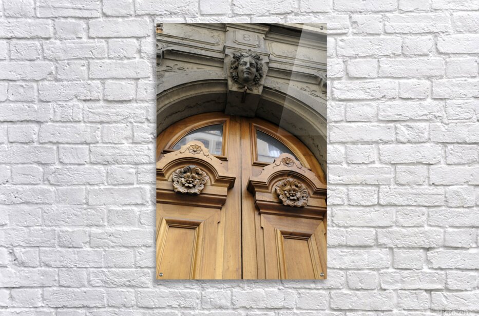 Wooden door with carved figurine in stone above it. France Picture Frame Printing