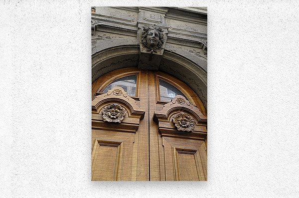 Wooden door with carved figurine in stone above it. France Kevin Oke Puzzle printing