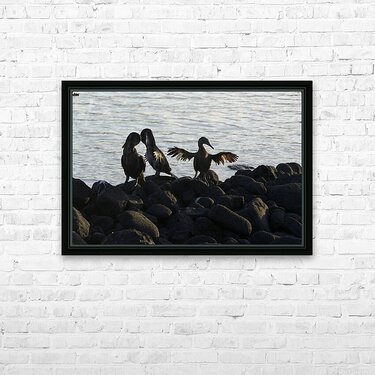 Flightless Cormorants Phalacrocorax harrisi stretching their wings. Punta Espinosa. Fernandina Island. Galapagos Islands. Ecuador Picture Frame Printing