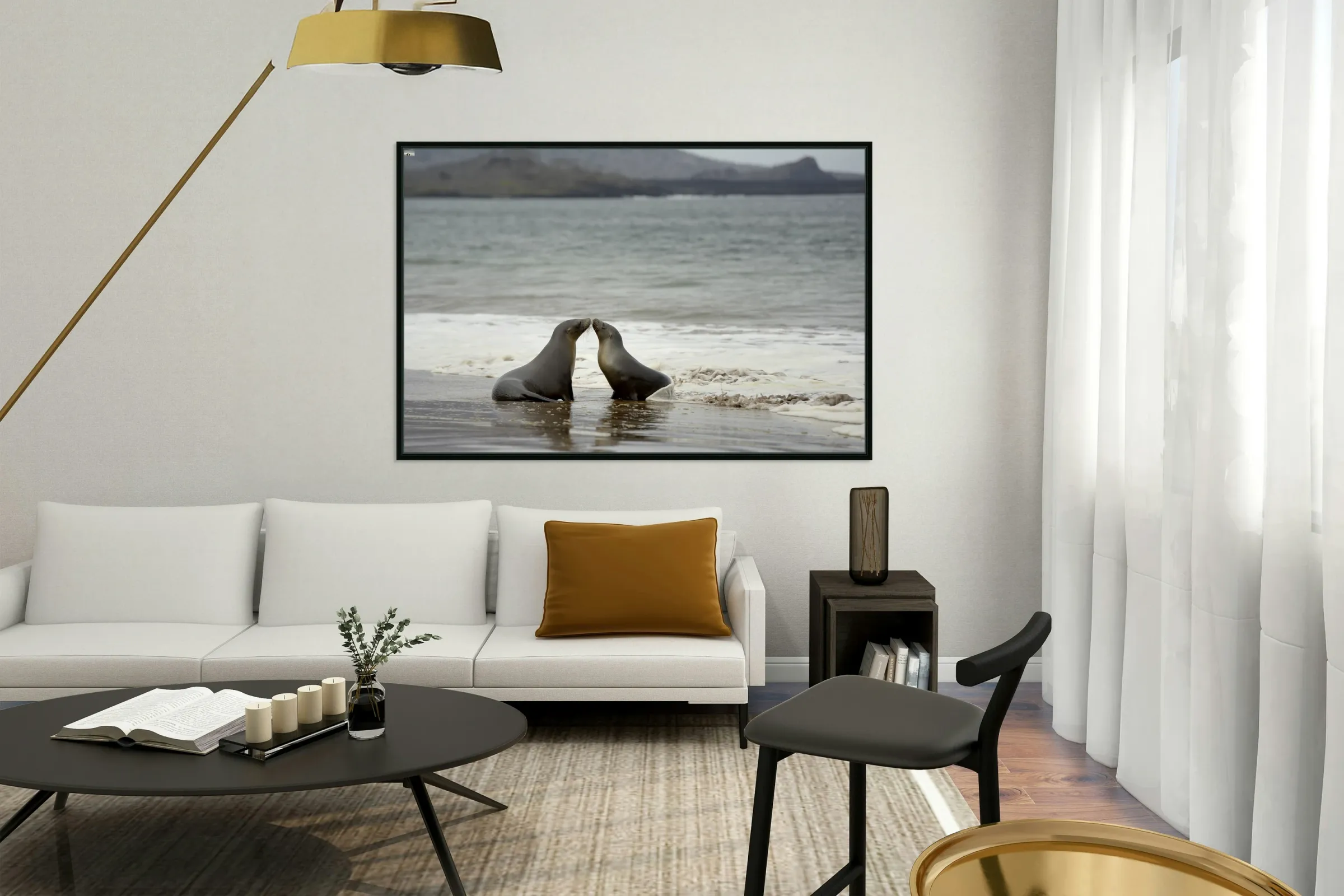 Get this artwork "Galapagos sea lions Zalophus wollebaeki playing in the waves on Playa Espumilla. Santiago Island. Galapagos Islands. Ecuador" in a framed print.