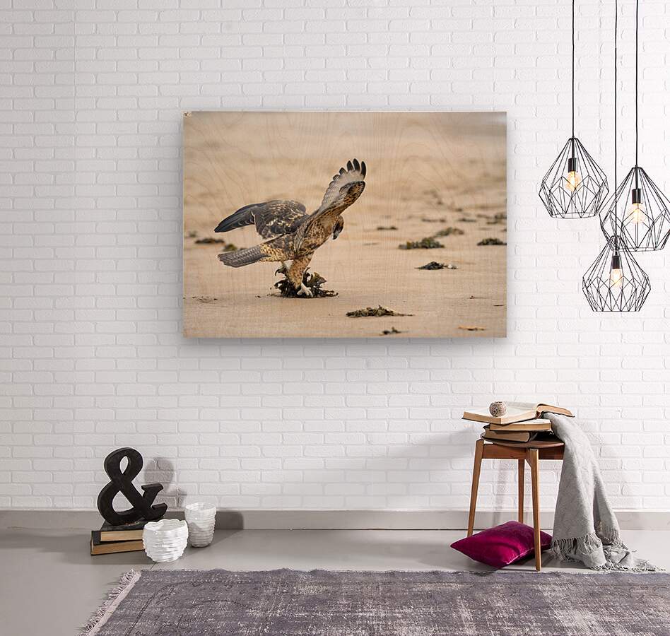 ABOUT THIS ARTWORK: GALAPAGOS HAWK LANDING ON ESPUMILLA BEACH. SANTIAGO ISLAND. GALAPAGOS ISLANDS. ECUADOR