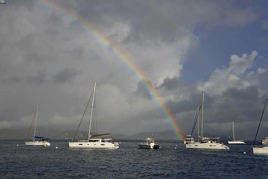 Catamarans and sailboats at the anchorage at Pussers Marina Cay par Kevin Oke [+]