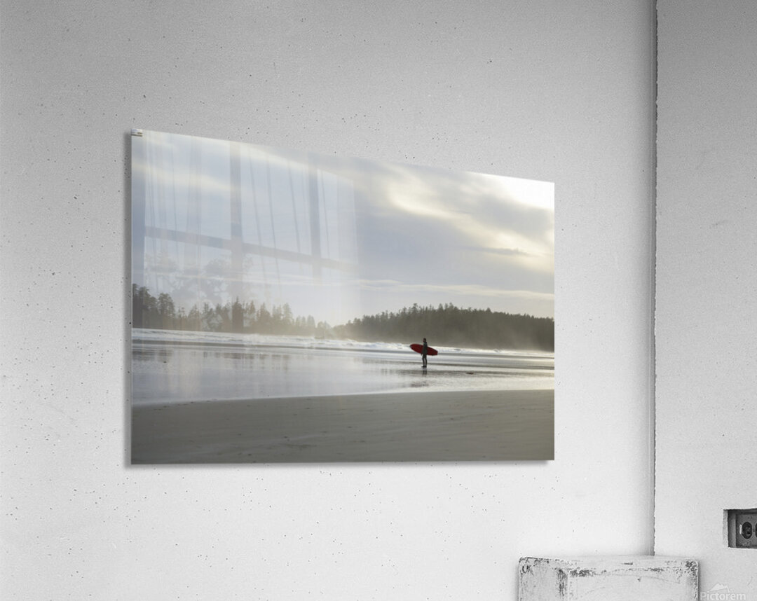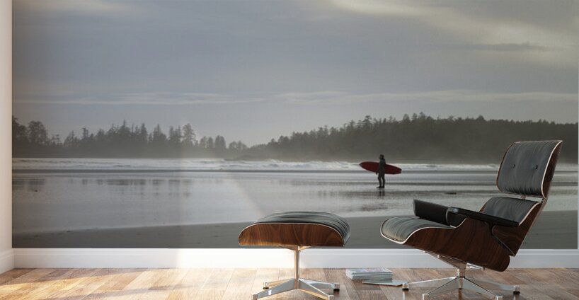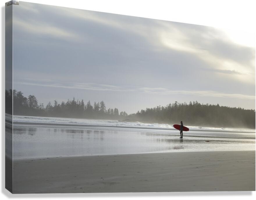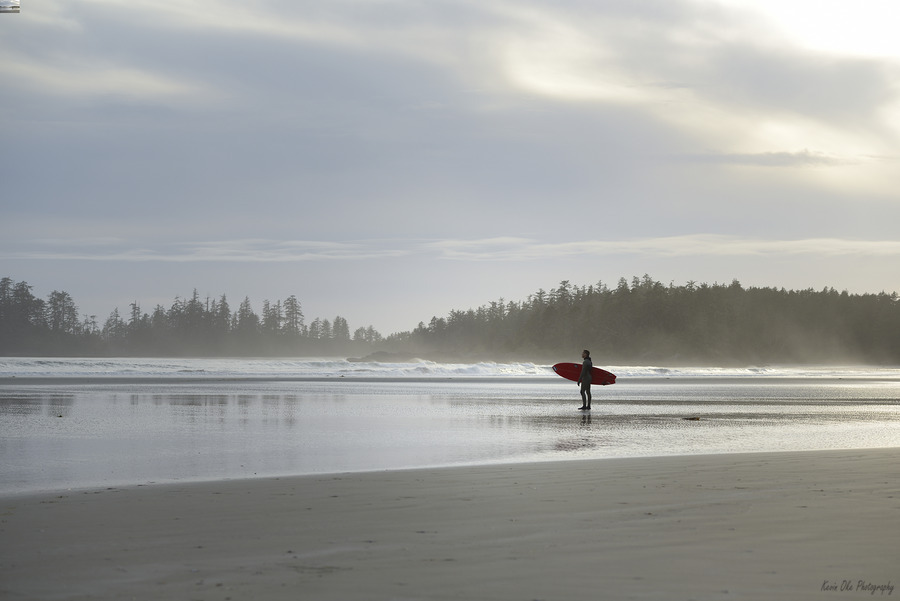 Man standing with red surfboard, Long Beach, Pacific Rim National Park, British Columbia