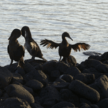 Flightless Cormorants Phalacrocorax harrisi stretching their wings Punta Espinosa Fernandina Island Galapagos Islands Ecuador