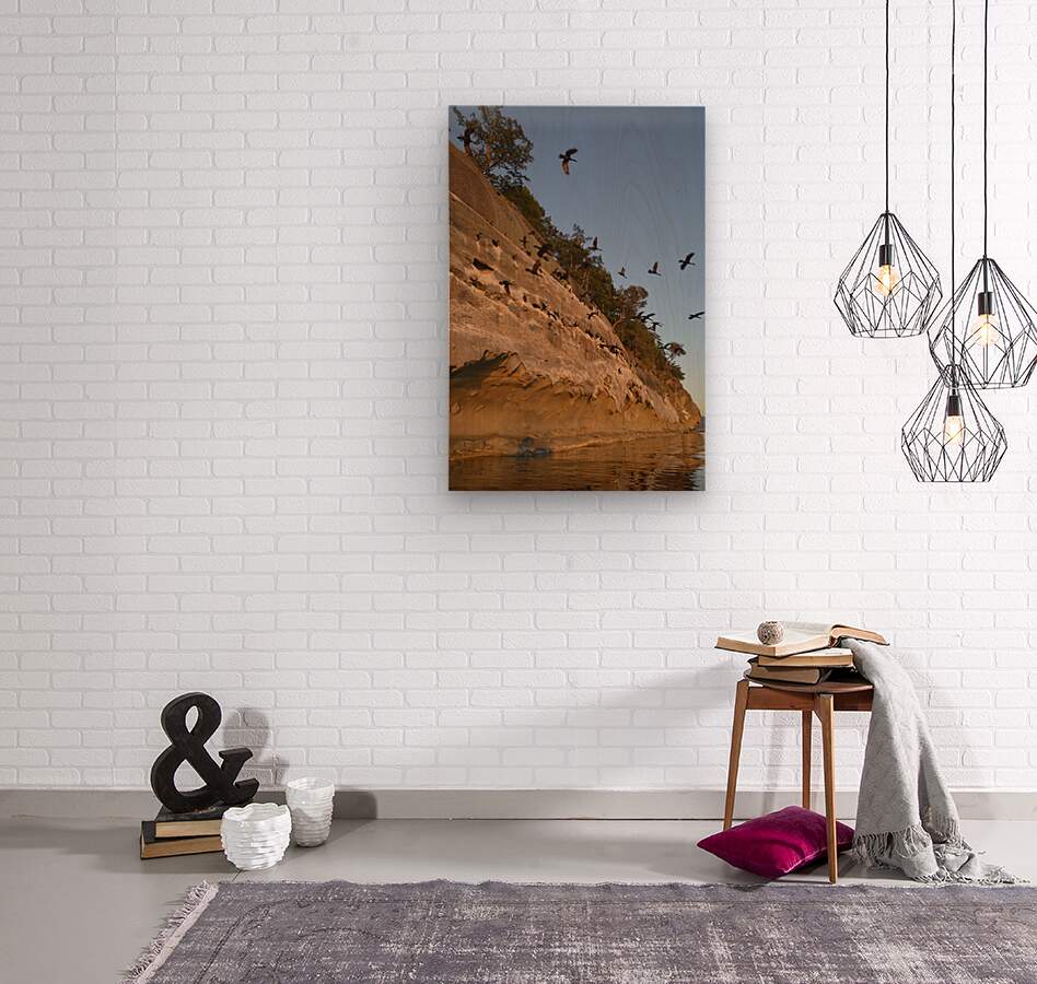 ABOUT THIS ARTWORK: CORMORANTS FLYING ABOVE SCULPTED SANDSTONE CLIFFS