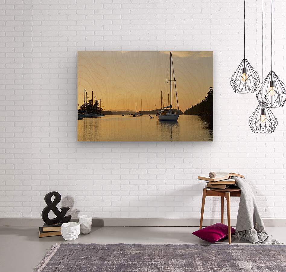 Sea kayaker and anchored boats in Princess Bay at sunset Wallace Island Gulf Islands British Columbia Canada