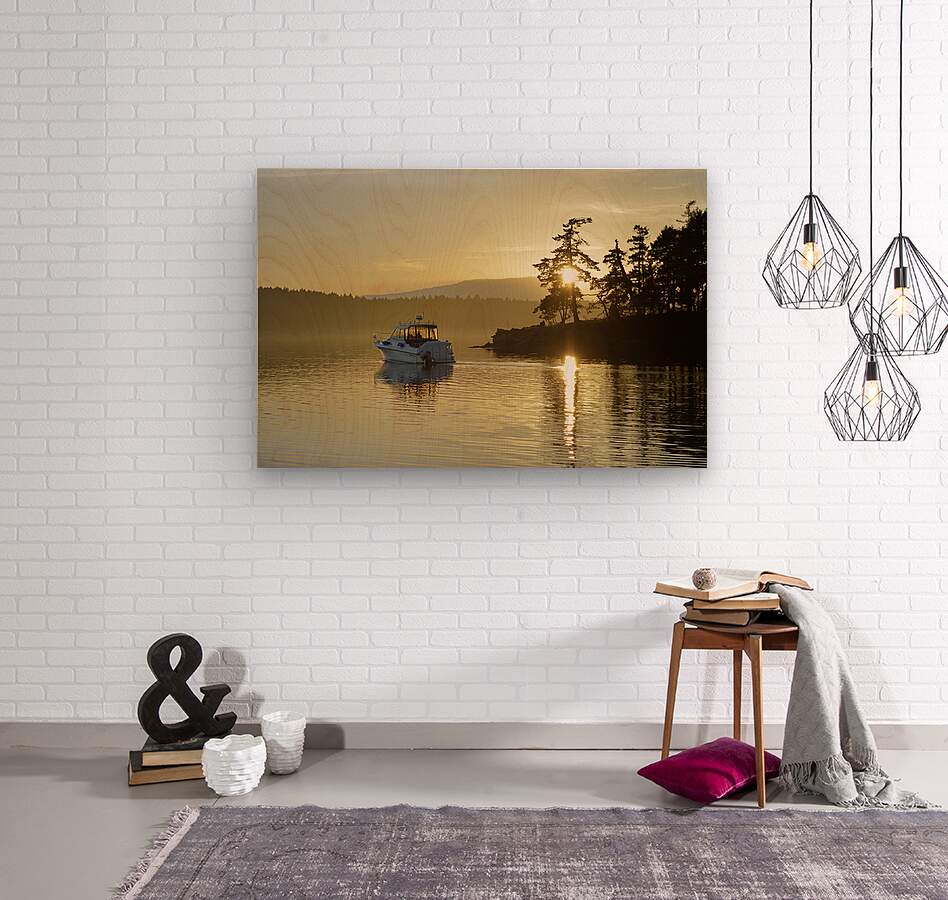 Small motor boat leaving Conover Cove at sunset Wallace Island Gulf Islands British Columbia Canada